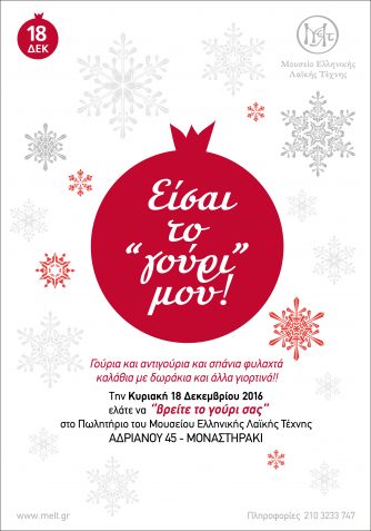 Το Πωλητήριο του Μουσείου Ελληνικής Λαϊκής Τέχνης  τις γιορτινές αυτές ημέρες στολίστηκε και σας περιμένει από την Κυριακή 18 Δεκεμβρίου 2016 για να ανακαλύψετε το γούρι σας. Οι εκπλήξεις που θα συναντήσετε θα σας γοητεύσουν. Πολλά γούρια, φυλαχτά και πολλά άλλα δώρα-έργα διακεκριμένων καλλιτεχνών του είδους σας περιμένουν.