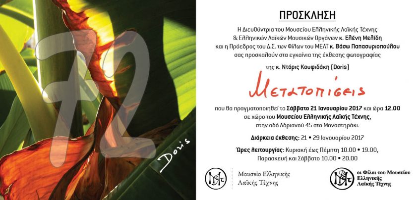 Το Μουσείο Ελληνικής Λαϊκής Τέχνης & Ελληνικών Λαϊκών Μουσικών Οργάνων – Συλλογή Φοίβου Ανωγειανάκη και το Σωματείο των Φίλων του Μουσείου διοργανώνουν τη φωτογραφική έκθεση «Μετατοπίσεις» της Ντόρις Κουφιδάκη (Doris).