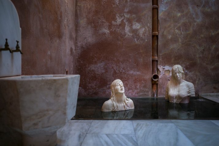 Η έκθεση εκκινεί από το πολυσήμαντο παρελθόν των λουτρικών οικοδομημάτων και αφηγείται μια κρυμμένη ιστορία, εξερευνώντας τα πολυδιάστατα κοινωνικά, ιστορικά και πολιτισμικά συμφραζόμενα της λουτρικής πρακτικής. Για τους καλλιτέχνες: το χαμάμ είναι ένας χώρος όπου ο άνθρωπος γυμνός, ελεύθερος από τα επενδύματά του, που του δίνουν ιδιαίτερα επίκτητα χαρακτηριστικά (φτωχός – πλούσιος), μπαίνει σε μια διαδικασία να αντιληφθεί πως χωρίς αυτά όλοι οι άνθρωποι είναι ίσοι, με τις ίδιες ανάγκες για χαλάρωση και κάθαρση. Ένας χώρος που κάτω από την καταλυτική επίδραση του νερού, εκτός από το σώμα χαλαρώνουν και οι αντιδράσεις απέναντι στον άλλο, τον «ξένο». Ένας χώρος που δίνει τη δυνατότητα εκτός από τη σωματική κάθαρση να προχωρήσει κανείς και στην εξίσου αναγκαία πνευματική κάθαρση. Τα έργα τους διαμηνύουν τα ηθικά και νοητικά βάρη που μοιάζουν να καταλύονται έστω και προσωρινά κατά τη λουτρική διαδικασία, μέσα από μια, αρχικά εξ’ ανάγκης αποδοχή του ξένου δίπλα μας… «Στο χαμάμ, μια μικρογραφία της κοινωνίας, δεν υπάρχουν ξένοι υπάρχουν μόνο άνθρωποι»